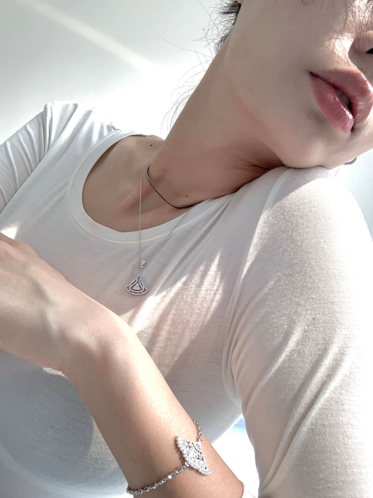赵今麦身着浅色连衣裙亮相,光影下的侧身回眸微笑,显得温婉动人